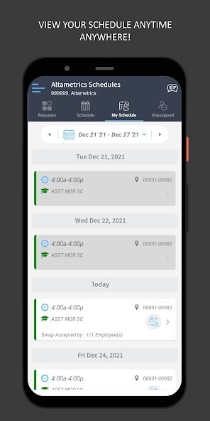 Altametrics Schedules puts the work schedule in your pocket. Requesting time-offs, swapping shifts, editing availability are just a click away.